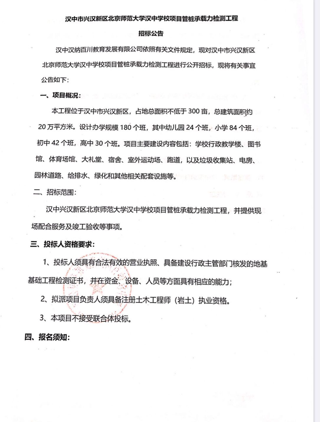 漢中市興漢新區(qū)北京師范大學(xué)漢中學(xué)校項(xiàng)目管樁承載力檢測(cè)工程招標(biāo)公告 漢中漢納百川教育發(fā)展有限公司...